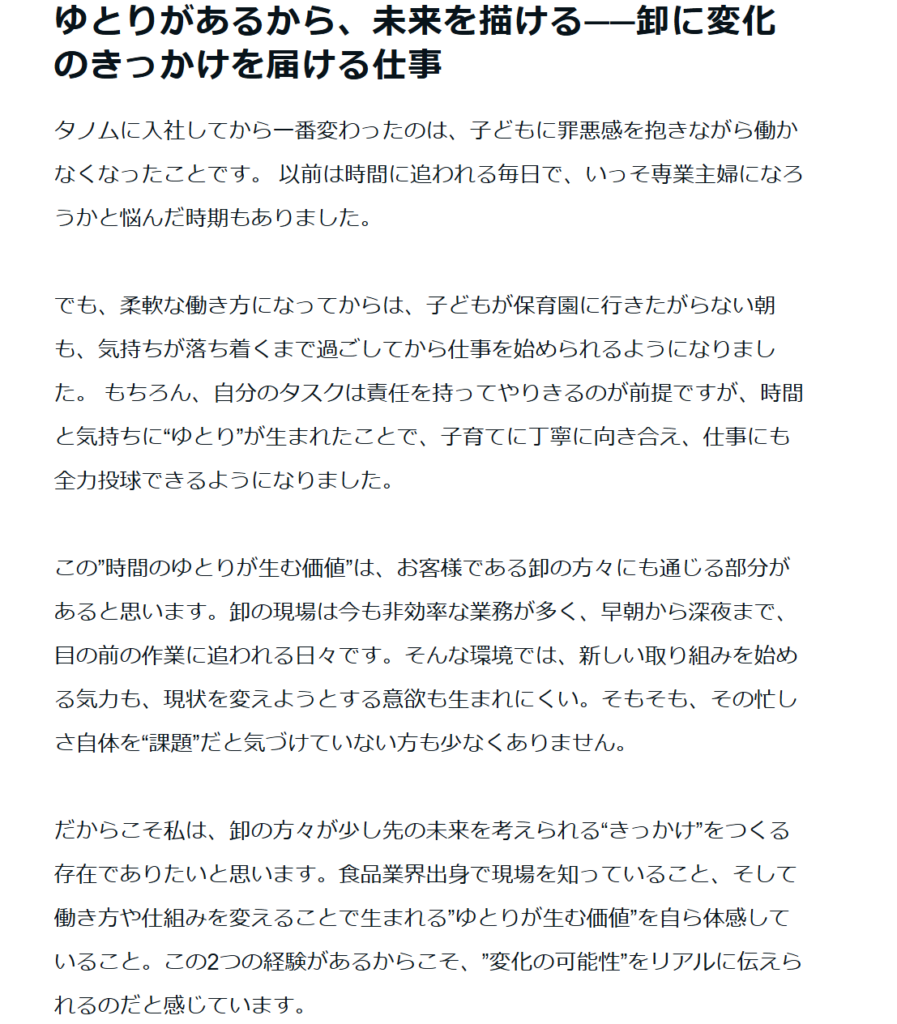 たとえば『“足で稼ぐ営業”から“共創する営業”へ──食品業界経験者が出会った卸の現場に変化を生み出す仕事』という記事では、「時間のゆとりが生む価値」というテーマが印象的でした。インタビューでは、仕事の話だけでなく、家庭の時間が生まれたというエピソードもお聞きしたのですが、その根底には「時間の余白が生む価値」という共通したテーマがあると捉え直し、仕事の話だけでなく、背景にある取材対象者の価値観まで伝わる構成にしました。「おそらく、こう感じているのではないか」「この言葉の背景には、こんな思いがあるのではないか」。そうした部分を丁寧に読み取りながら言語化することで、取材対象者にとっても、新たな気づきにつながる記事になることを意識しています。